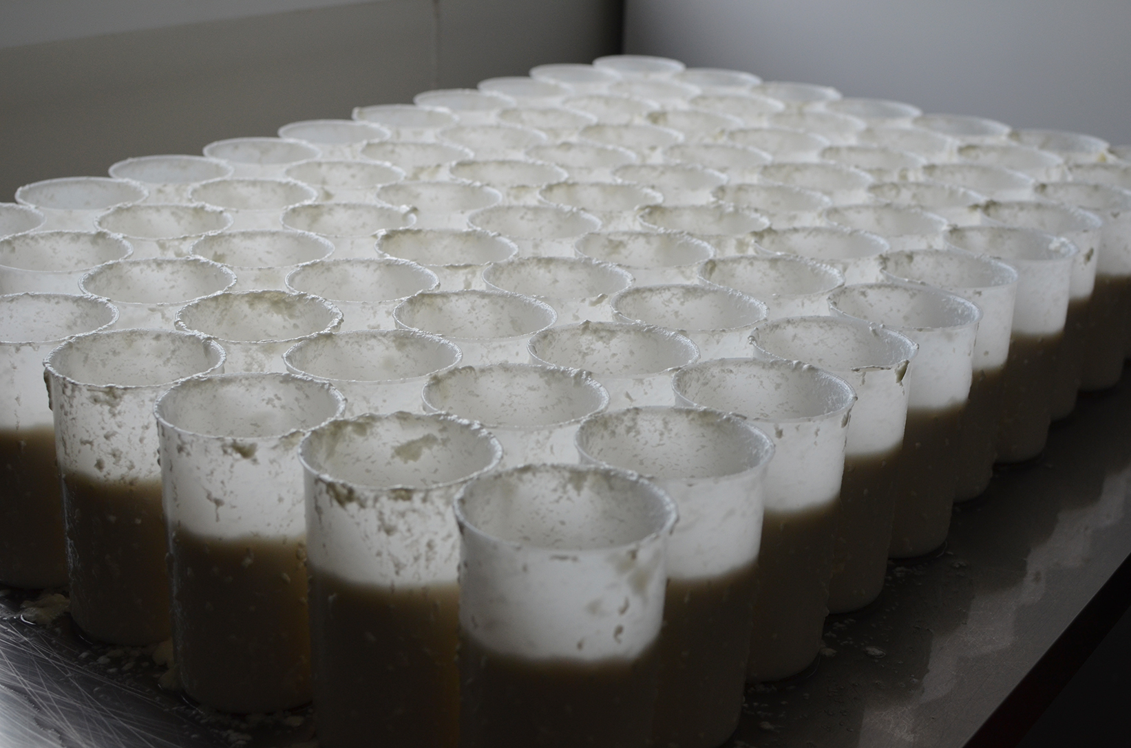 Après la traite, Lætitia commence le travail du lait cru immédiatement : encore chaud, il est plus riche et donc meilleur pour la transformation. Elle met le lait à cailler pendant 24 heures en introduisant du ferment et de la présure. Le lendemain, après la traite et la mise à cailler du lait du jour, (ça va, vous suivez ?) c'est l'étape du moulage : le lait de la veille qui a caillé durant 24 heures est moulé à la louche dans des récipients percés pour que s'égoutte lentement le petit lait. Et cette perte d'humidité est énorme puisqu'il faut 80 cl de lait caillé pour obtenir au final un petit (mais délicieux!) crottin !!